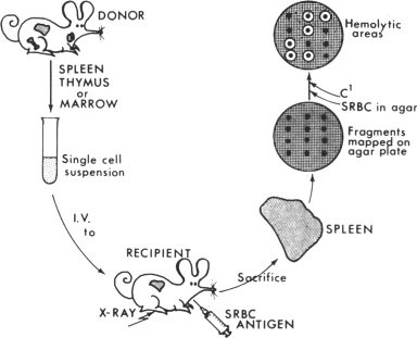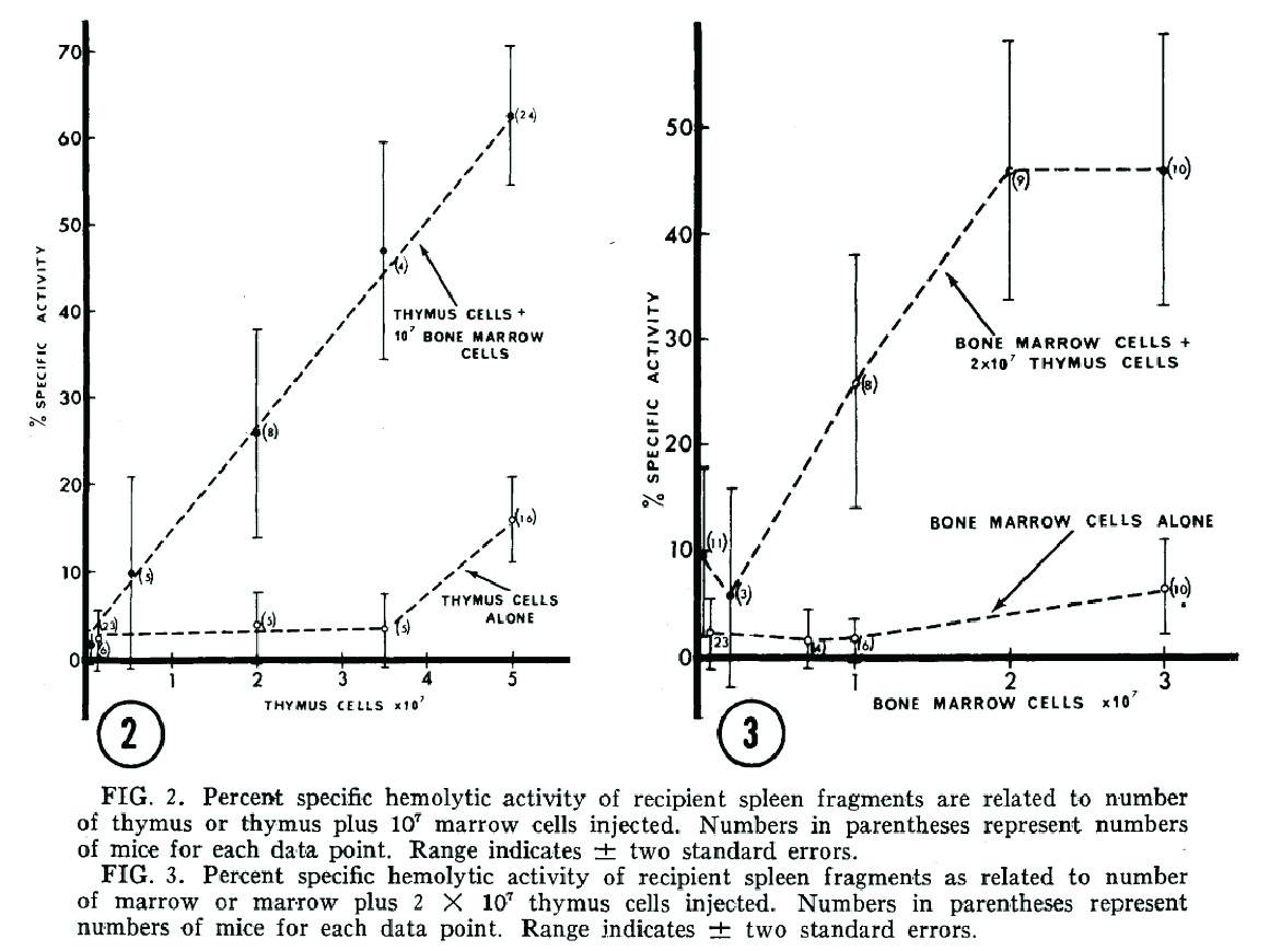 1966년 Henry N. Claman의 흉선–골수 재구성 실험을 통해 항체 반응이 흉선세포와 비장세포의 협동 과정임이 처음으로 증명되었다.