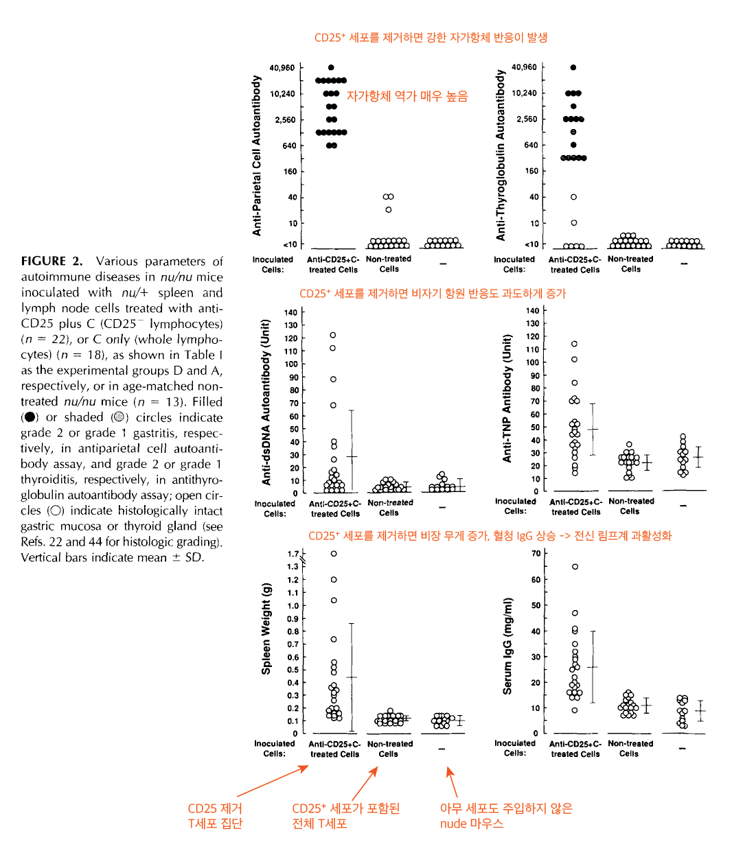 당시 해석은 이들이 “활성화된 T세포(activated T cells)”일 가능성을 포함하고 있었습니다. 오늘날 우리는 이 집단을 **조절 T세포(regulatory T cell, Treg)**로 이해하지만, 1995년 당시에는 아직 FOXP3도, Treg 개념도 확립되지 않은 상태였습니다.
