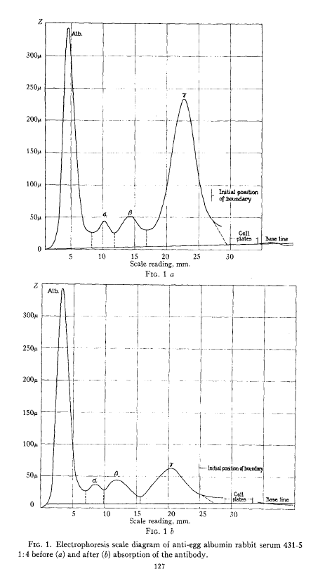 1939년 Tiselius와 Kabat은 전기영동법을 이용해 항체가 감마 글로불린에 속함을 명확히 보여주었다. 이 논문은 면역화학의 출발점으로 평가된다.