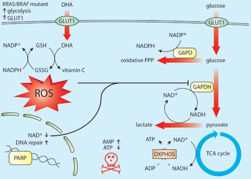 비타민 C가 산화된 형태를 디하이드로아스코르빈산(dehydroascorbate, DHA)이라고 합니다. 이 형태의 비타민 C는 환원형 비타민 C와 달리, 포도당 수송체인 GLUT1을 통해 세포 내부로 유입될 수 있습니다.